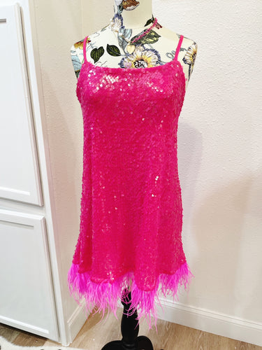 Hot Pink Sequin Dress with Feathers