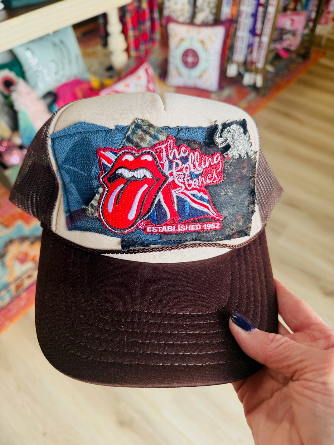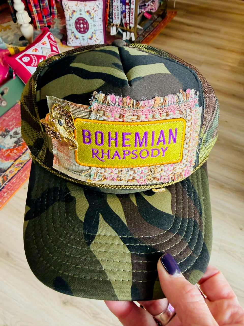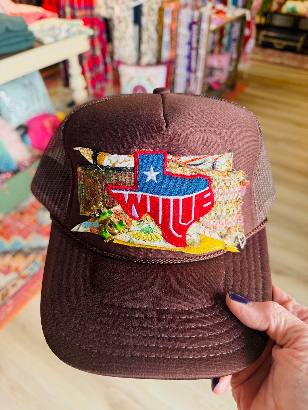 Trucker Hats embellished with brooches and vintage fabric ... each one is unique and hand sewn right here in Texas. Snap back trucker so it can adjust to any size.