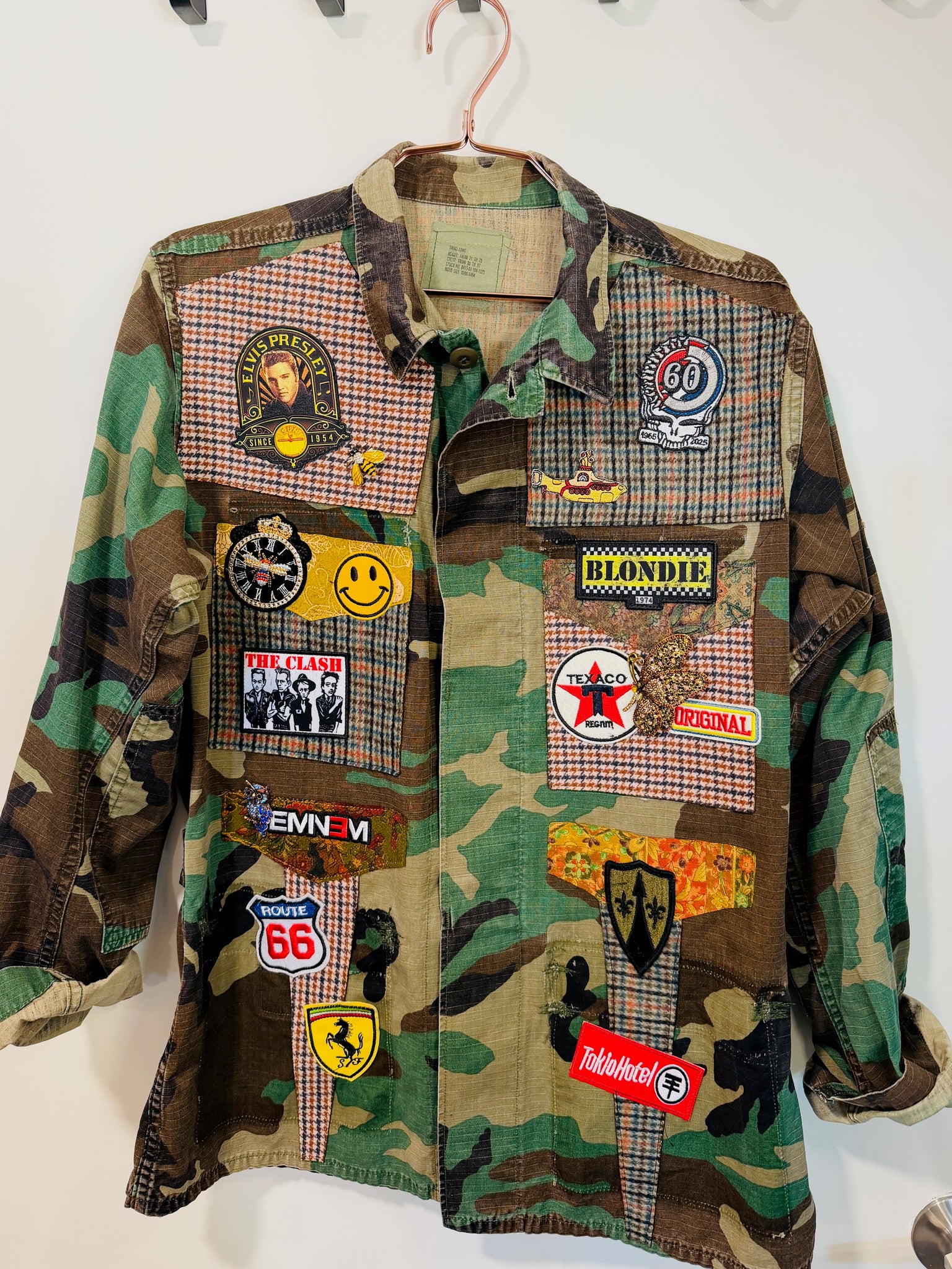 Each jacket is unique and one of a kind! Vintage camo army jackets decorated with patches, vintage fabric and embellished with cute brooches. Actual men's army jacket so fit is men's med/ large. Sleeves can be buttoned to tighten