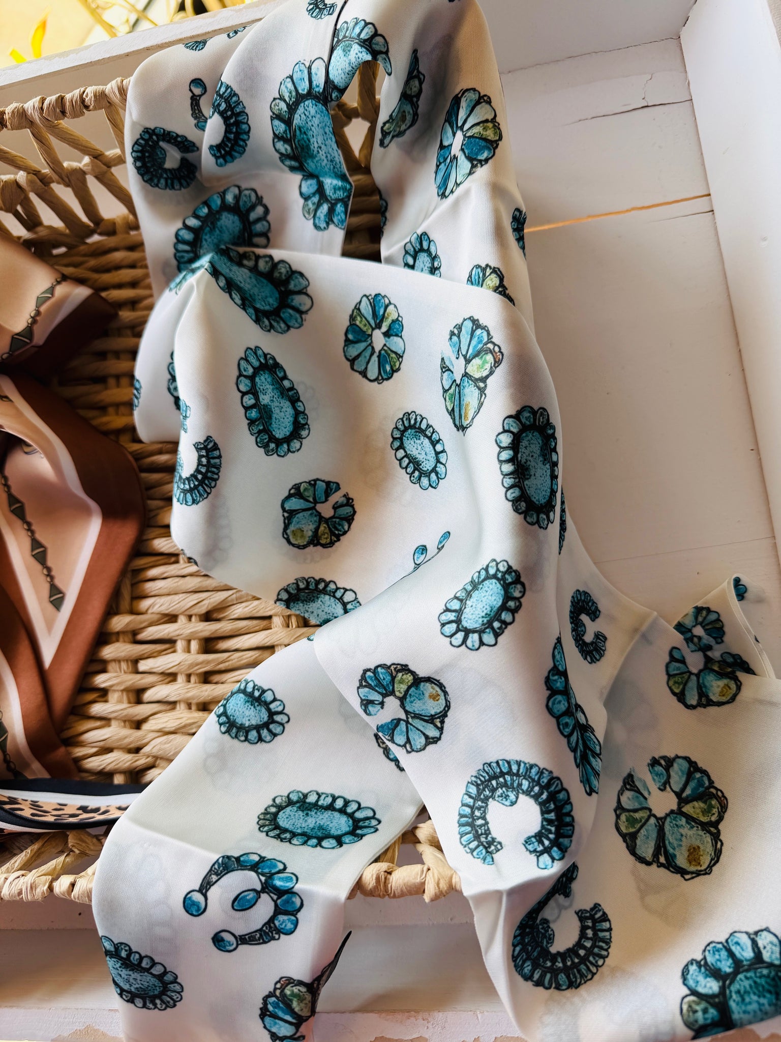 Oblong scarf that can be tied so many cute ways! Silky soft and printed on both sides - 54" long.