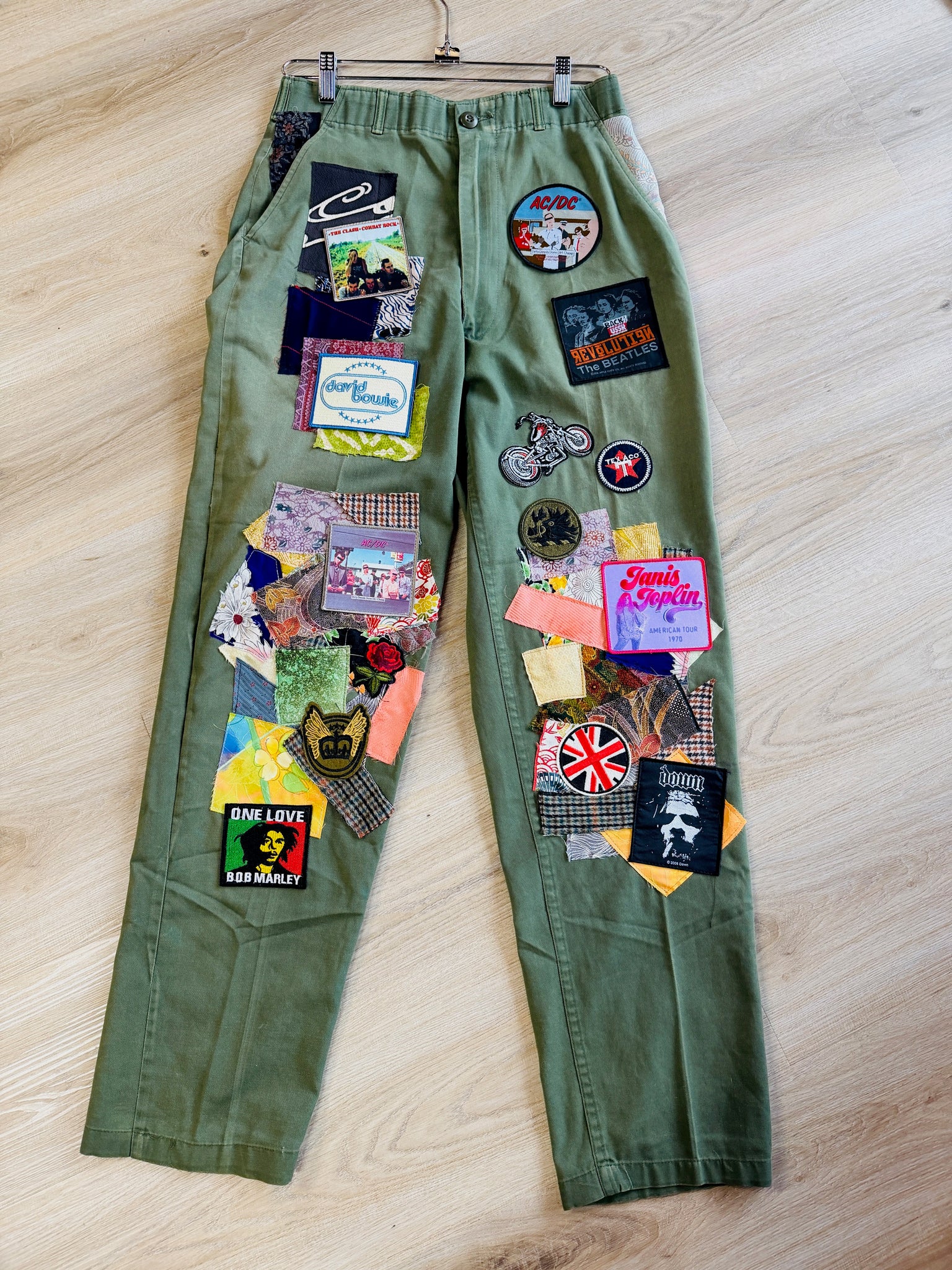 Unique and def one of a kind - these vintage army camo pants are decorated with the cutest patches ... everything from classic country star pics, to rock n roll and embellished with vintage fabric too. Typically, men's pants so they vary in size and fit.