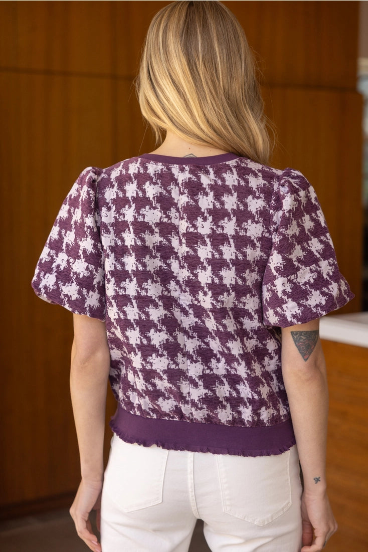 Cute and flattering? Best-selling style now in a chic houndstooth check. Round neckline with  bubble sleeve and a soft elastic hemline.